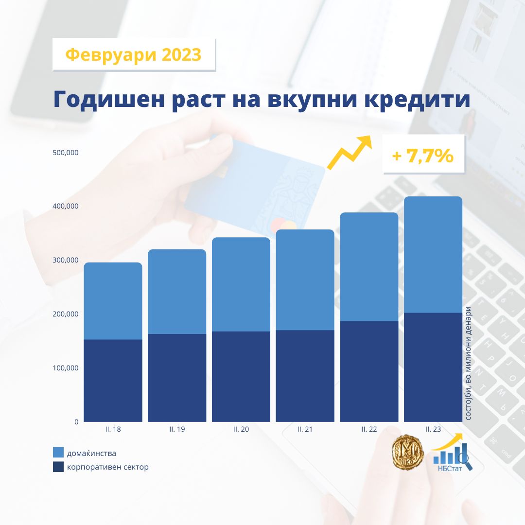 февруари 2023 година, потрошувачките и станбените кредити, како најзастапени категории, бележат месечен раст од 0,4% и 0,8%, соодветно, при годишен раст од 6,3% и 12,3%, соодветно. Овој месец, автомобилските кредити се намалени за 0,3% на месечна основа, додека на годишна основа бележат раст за 11,8%. Во февруари, кај кредитите одобрени на кредитни картички и негативните салда на тековни сметки е остварен месечен пад за 1,1% и 1,3%, соодветно, додека на годишна основа тие се повисоки за 0,8% и 0,4%, соодветно.