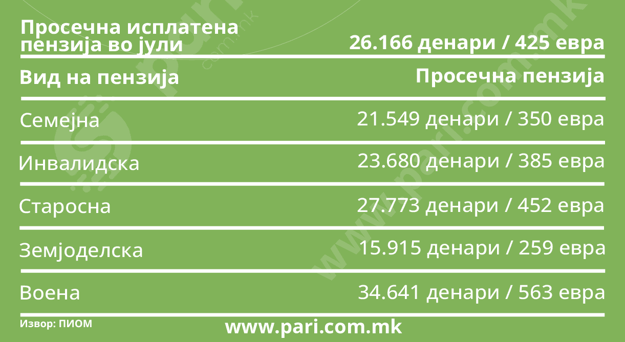 Во јули просечната старосна пензија изнесува 452 евра, инвалидската 385 евра, а семејната 350 евра. Вообичаено, најниски се земјоделските пензионерски примања (259 евра), а највисоки воените 563 евра.