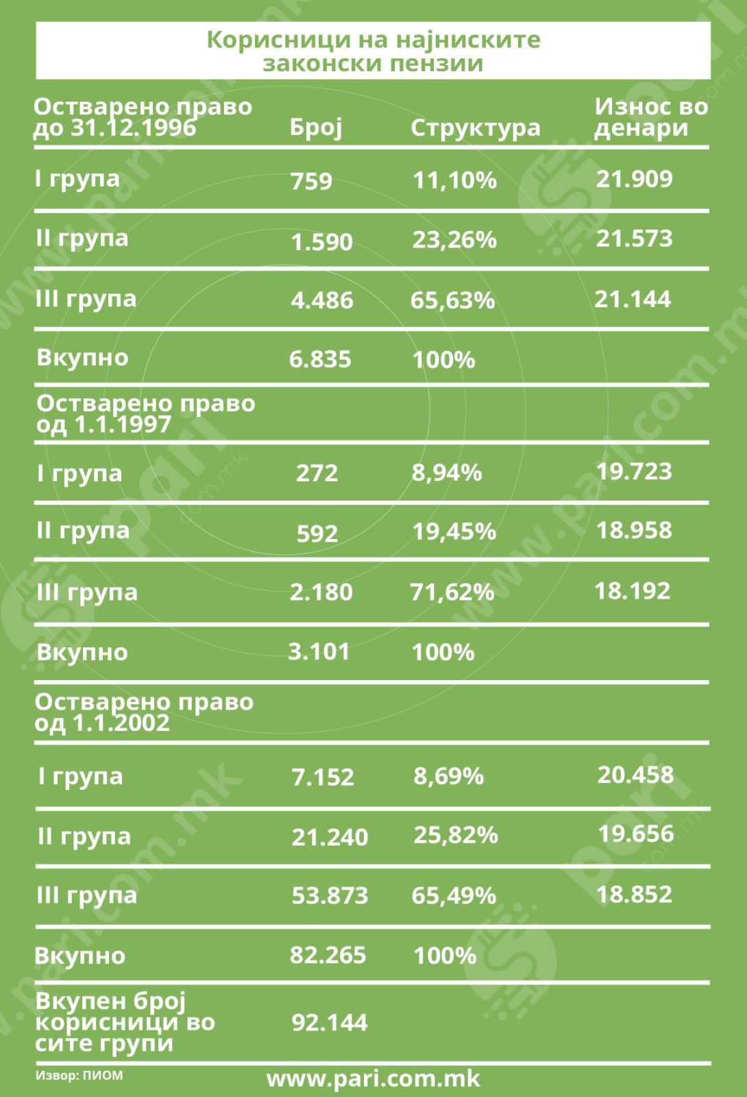 На спротивната страна се повеќе од 92 илјади пензионери како корисници на најниските законски пензии, од 296 до 356 евра. Најмалиот износ (18.192 денари) е предодреден за 2.180 лица, кои се пензионирале од почетокот на 1997 година. Највисоката од најниските пензии (21.909 денари) оди на сметките од 759 пензионери, кои работниот век го завршиле до први декември 1996 година. Според бројноста (53.873) се издвојува третата група од пензионираните по први јануари 2002 година, чии пензии од 18.852 денари се единствено подобри од убедливо најниските.