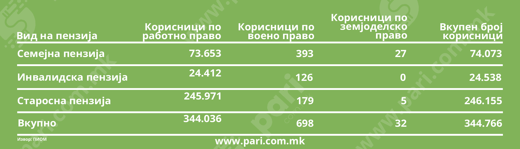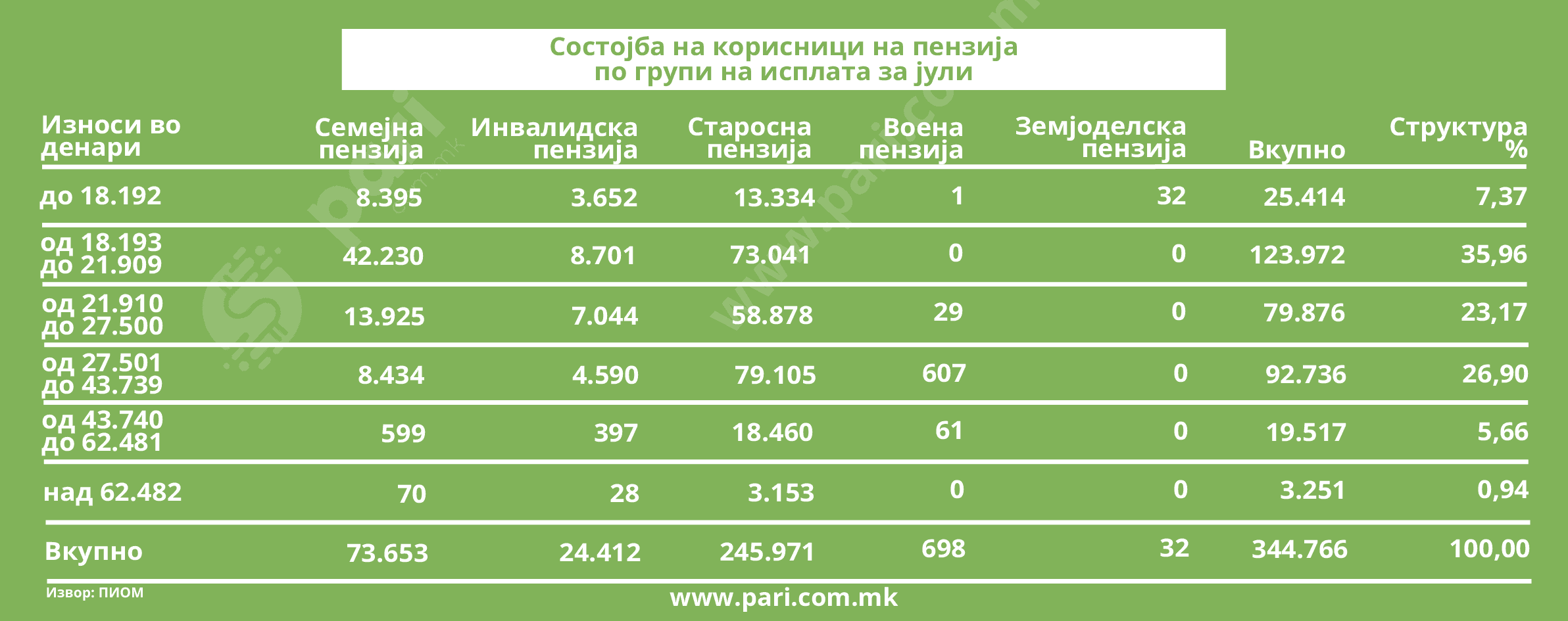 Пензија во јули примиле 344.766 лица, од кои најголемиот дел, 246.155 – се старосни пензионери. Просечната исплатена пензија изнесувала 26.166 денари или 425 евра, што е речиси идентично со јунскиот износ (26.207 денари). За еден месец бројот на пензионери кои живеат со најниските законски пензии е зголемен за 485. Намалување за 143 лица има кај примателите на пензии со суми над 62.482 денари. Непроменета е состојбата кај највисоките пензии – 88.013 денари стигнале на сметките од 18 пензионери. Ова се податоците од јулската статистика на Фондот за пензиско и инвалидско осигурување.