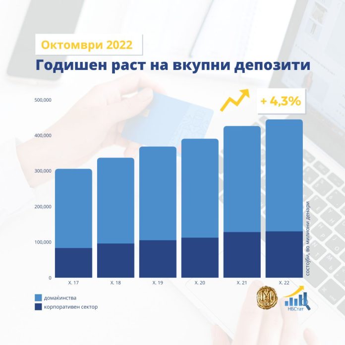 Годишен раст од 4,3% на вкупните депозити и од 10,1% на вкупната кредитна поддршка во октомври 2022 година.
