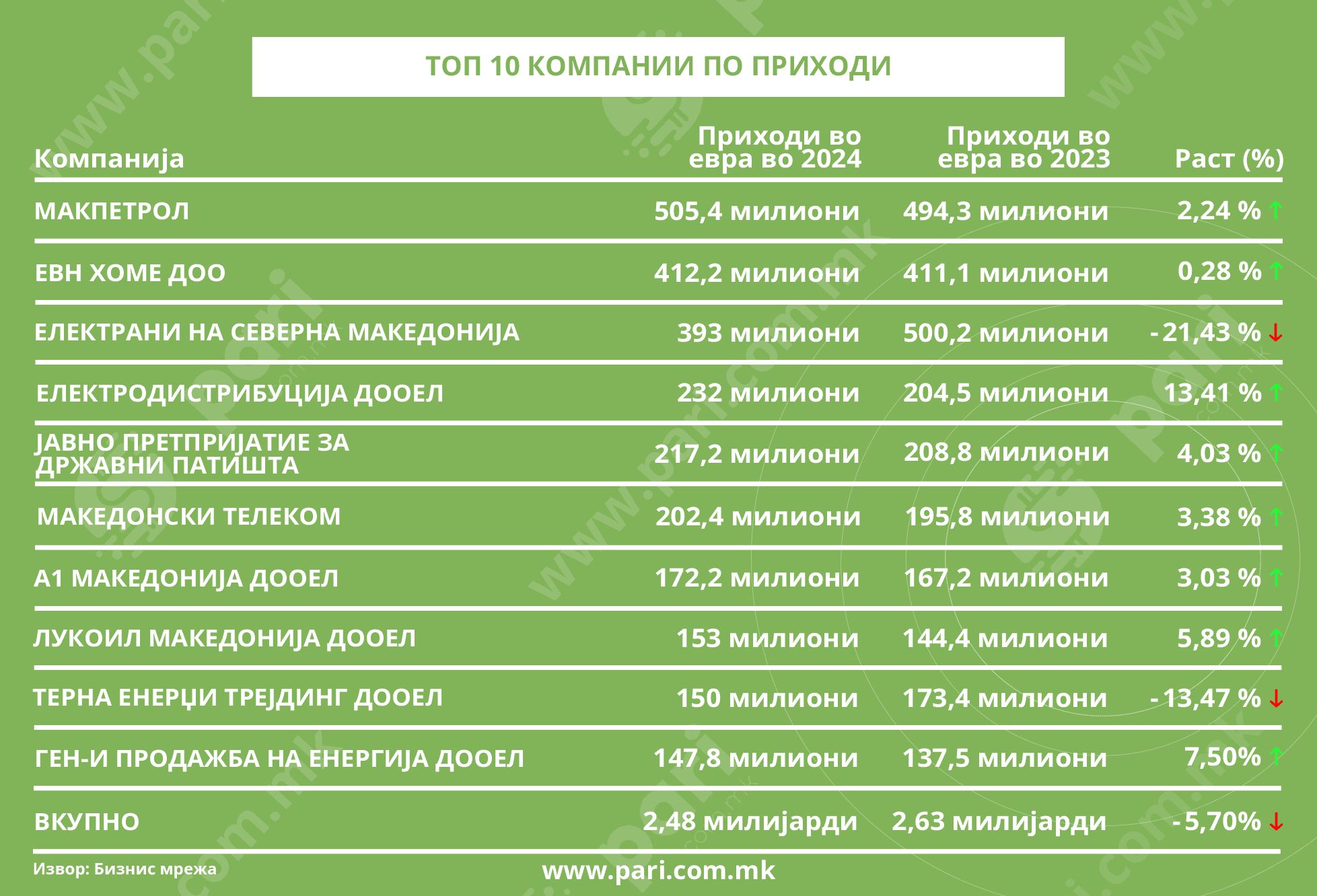 Меѓу десетте компании со околу 200 милиони евра приход се и Електродистрибуција, Јавно претпријатие на државните патишта и Македонски телеком.
