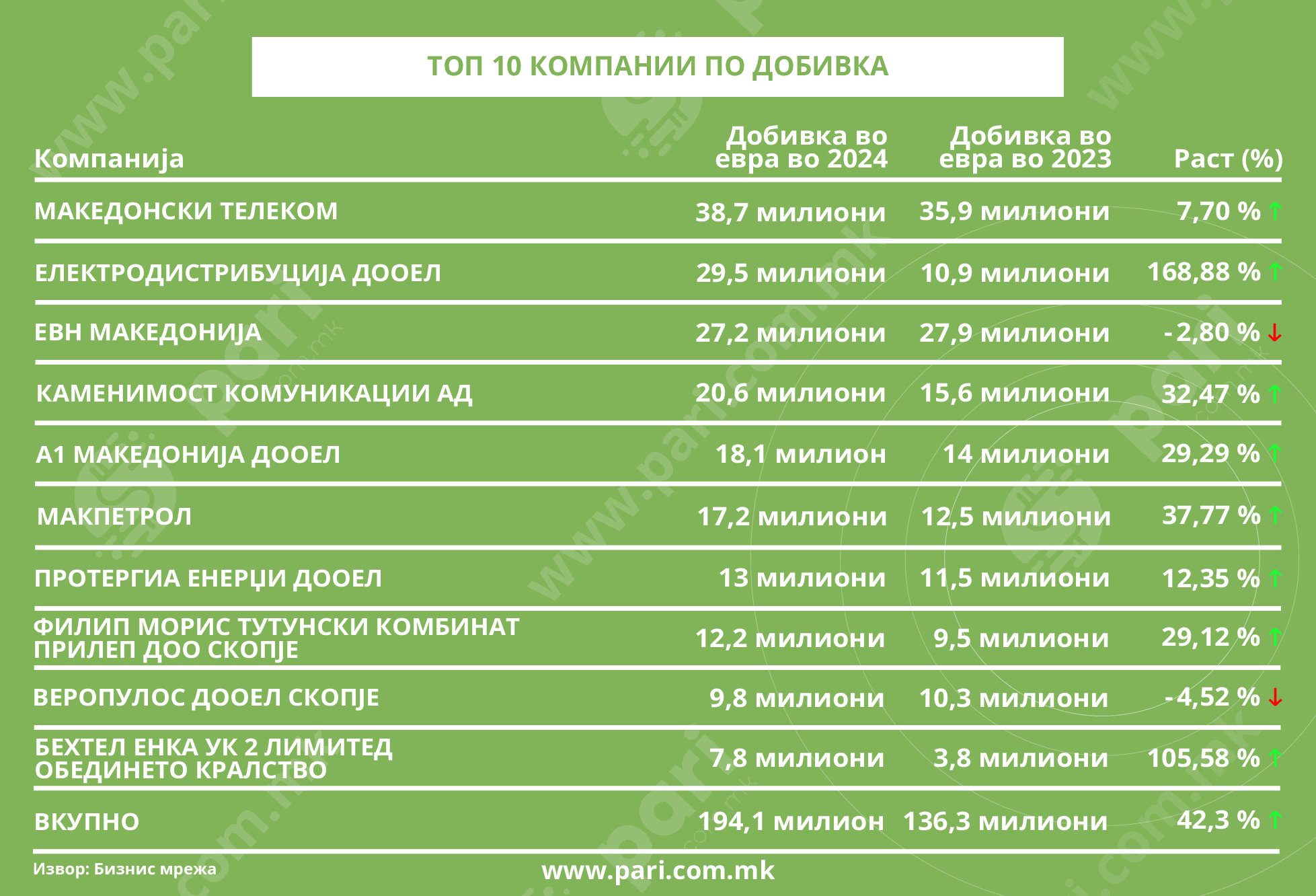 Лидер по добивка е Македонски Телеком, кој завршил со чиста добивка од 38,7 милиони евра и раст од 7,7 насто.