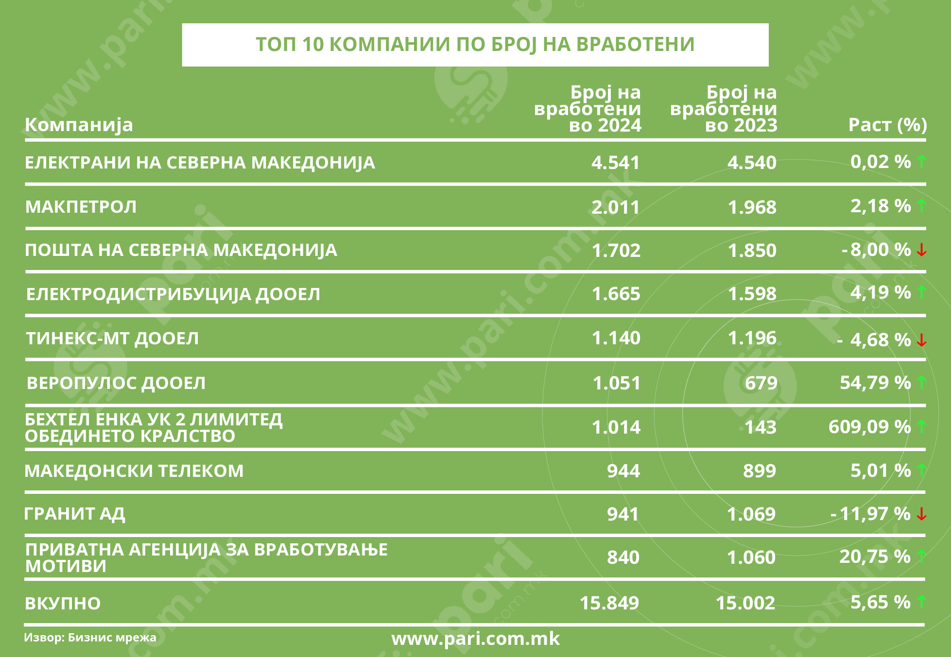 Огромен раст во однос на вработените има остварено Бехтел и Енка (609 %). Во 2023 година бројот на работните лица изнесувал 143, а во 2024 година – 1.014.
