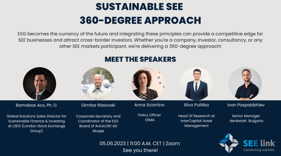Во организација на SEE Link утре, на 5 јуни, со почеток во 11 часот на ZOOM ќе се одржи онлајн настан под наслов „Sustainable SEE: 360* approach – powered by SEE Link“. На настанот, посветен на таканаречената ESG рамка (животна средина, социјала и управување) ќе настапат повеќе реномирани предавачи, како Акс Барнабас, претставник на London Stock Exchange Group, Ана Скортино, одговорна за политики на Европско тело за хартии од вредност и пазари ЕСМА, Ѓиво Пулитика, раководител за истражувања во Inter Capital Asset Management, Димитар Ристовски, координатор на Одборот на ЕСГ при Алкалоид АД Скопје и Иван Паспалџиев од реномираната консултантска куќа Denkstrat Bulgarija.