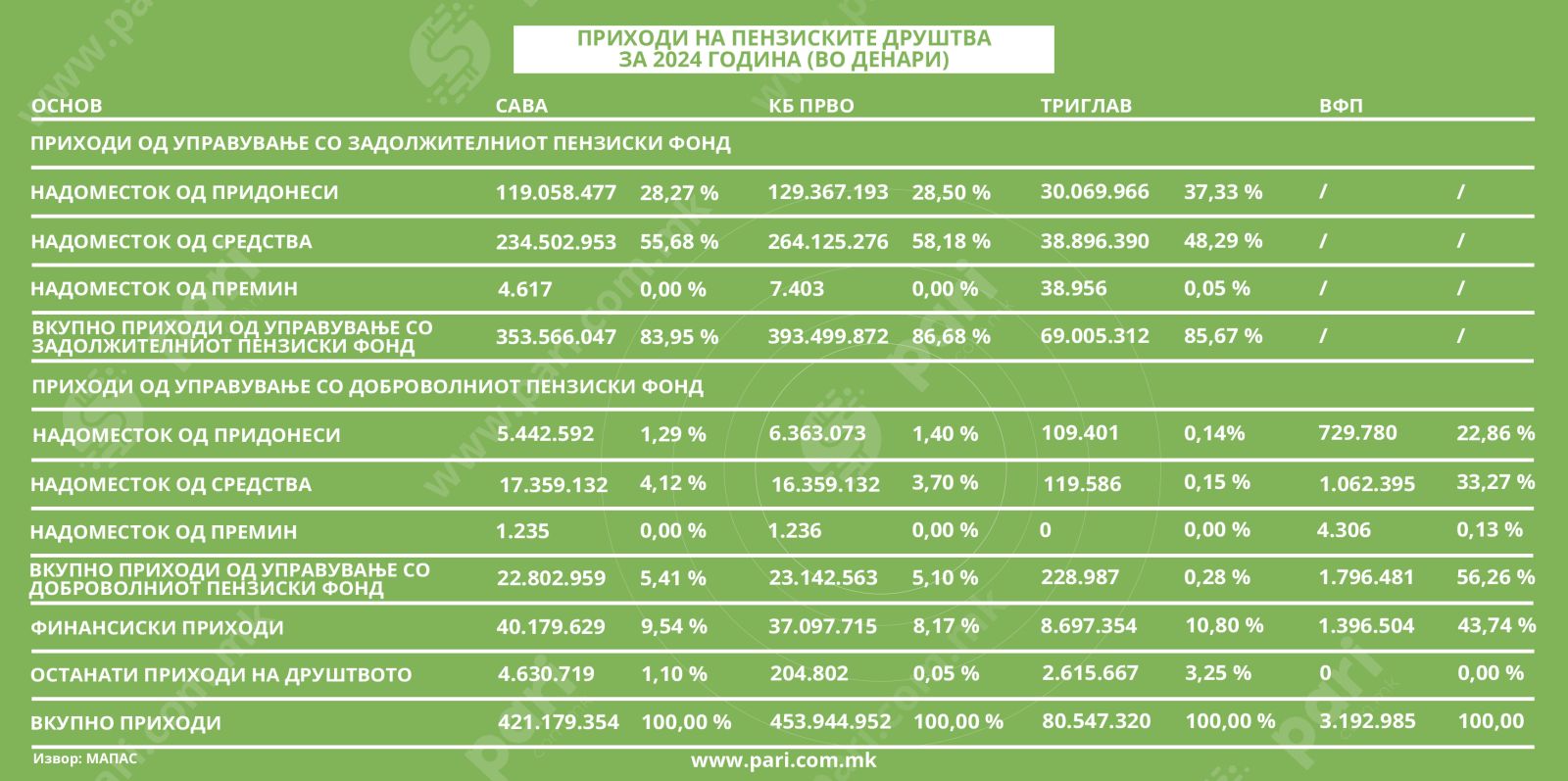 Друштвата кои управуваат со парите на пензиски фондови, имаат неколку законски утврдени канали за финансирање. Наплатуваат надоместоци од придонеси, од средствата на пензиските фондови и од преминувањето од едно во друго друштво. Исто така, остваруваат финансиски приходи и од вложувањата на слободните парични средства во депозити и хартии од вредност, согласно Законот за доброволно капитално финансирано пензиско осигурување.