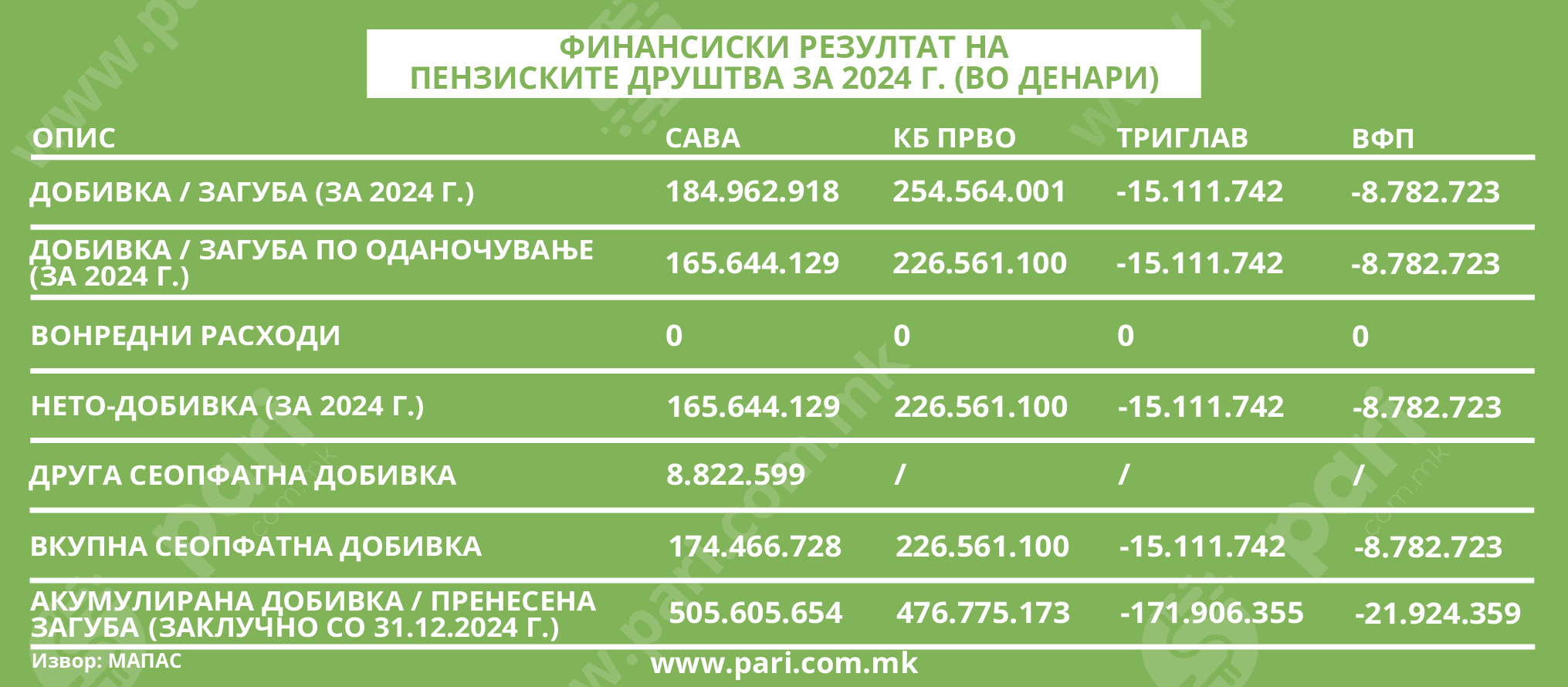 Од друга страна, Триглав пензиско веќе шеста година работи со загуба. Од МАПАС тоа го објаснуваат со сѐ уште малиот број членови во задолжителниот пензиски фонд што влијае врз приходите, а трошоците се значителни. И за ВФП пензиско друштво, кој управува само со доброволен фонд, а бележи негативен резултат, МАПАС оценува дека е тоа очекувано во раните години на работење.