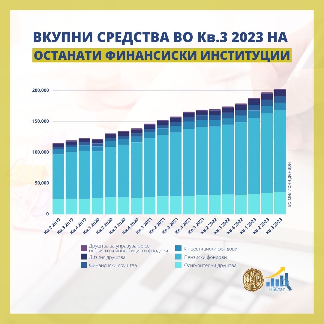 Вкупните средства на останатите финансиски институции – пензиски фондови, осигурителни друштва, инвестициски фондови, финансиски друштва, лизинг друштва и друштва за управување со пензиски и инвестициски фондови изнесуваат 201.059 милиони денари или 3,26 милијарди евра и имаат квартален раст од 4.201 милион денари, односо 68,2 милиони евра. Во средствата на финансиските институции партиципираат со 19,5 проценти.
