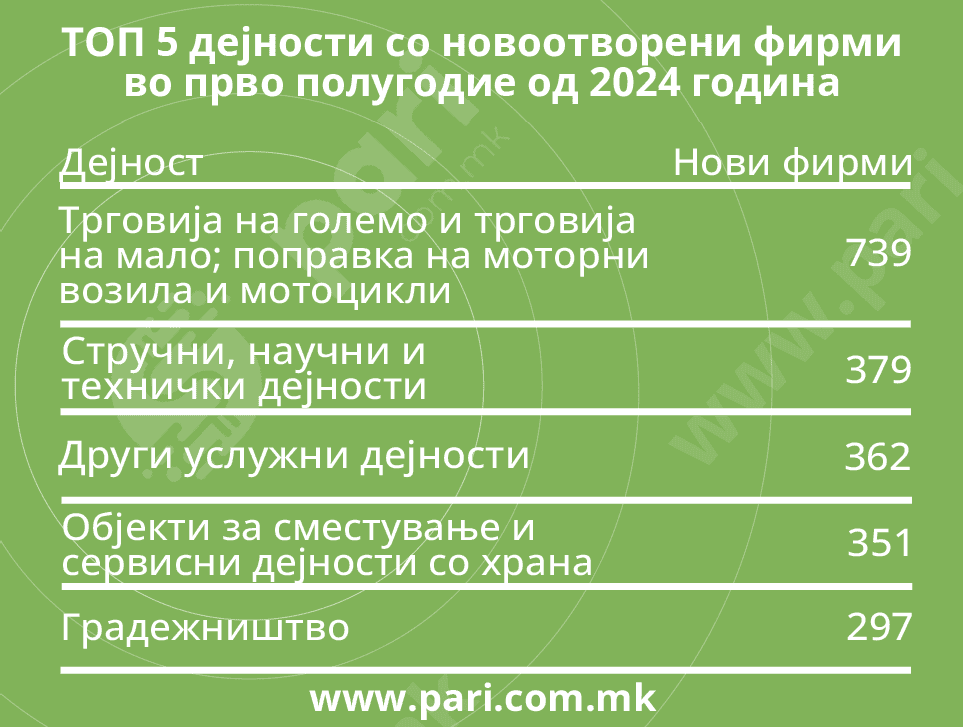 ТОП 5 дејности со новоотворени фирми во прво полугодие од 2024 година