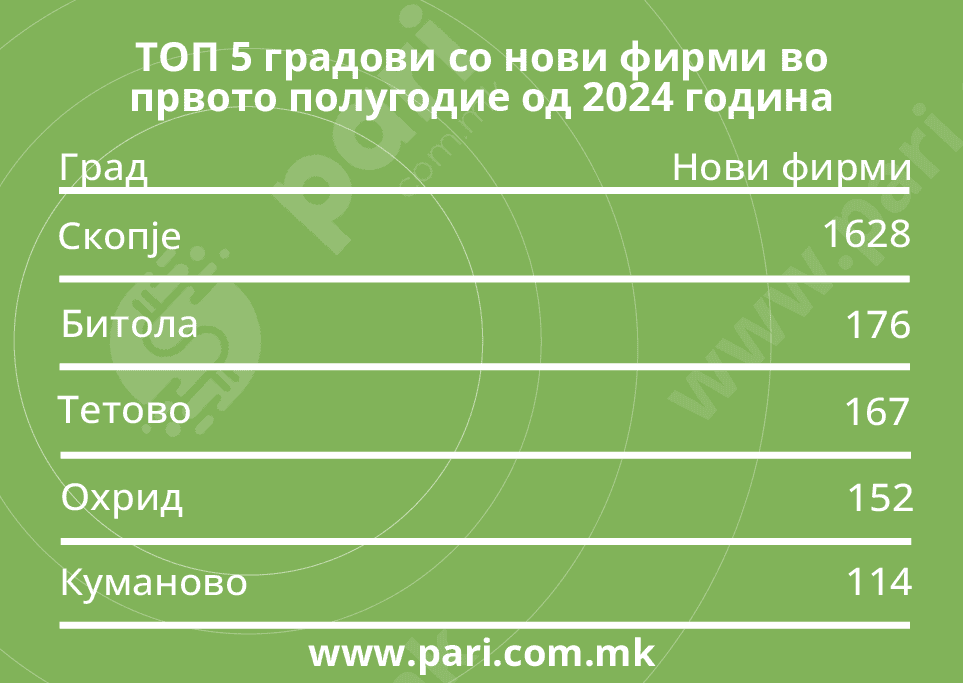 ТОП 5 градови со нови фирми во првото полугодие од 2024 година