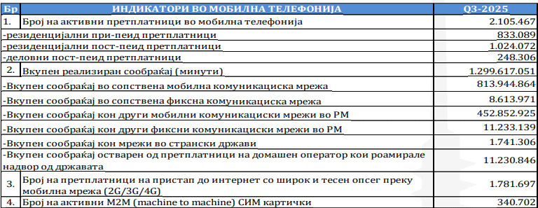 Податоците на Агенцијата за електронски комуникации се однесуваат на периодот заклучно со третиот минатогодишен квартал. Притоа, во вкупната претплатничка база има 833.089 резиденцијални припеид претплатници, 1.024.072 резиденцијалн постпеид и 248.306 деловни постпеид претплатници.