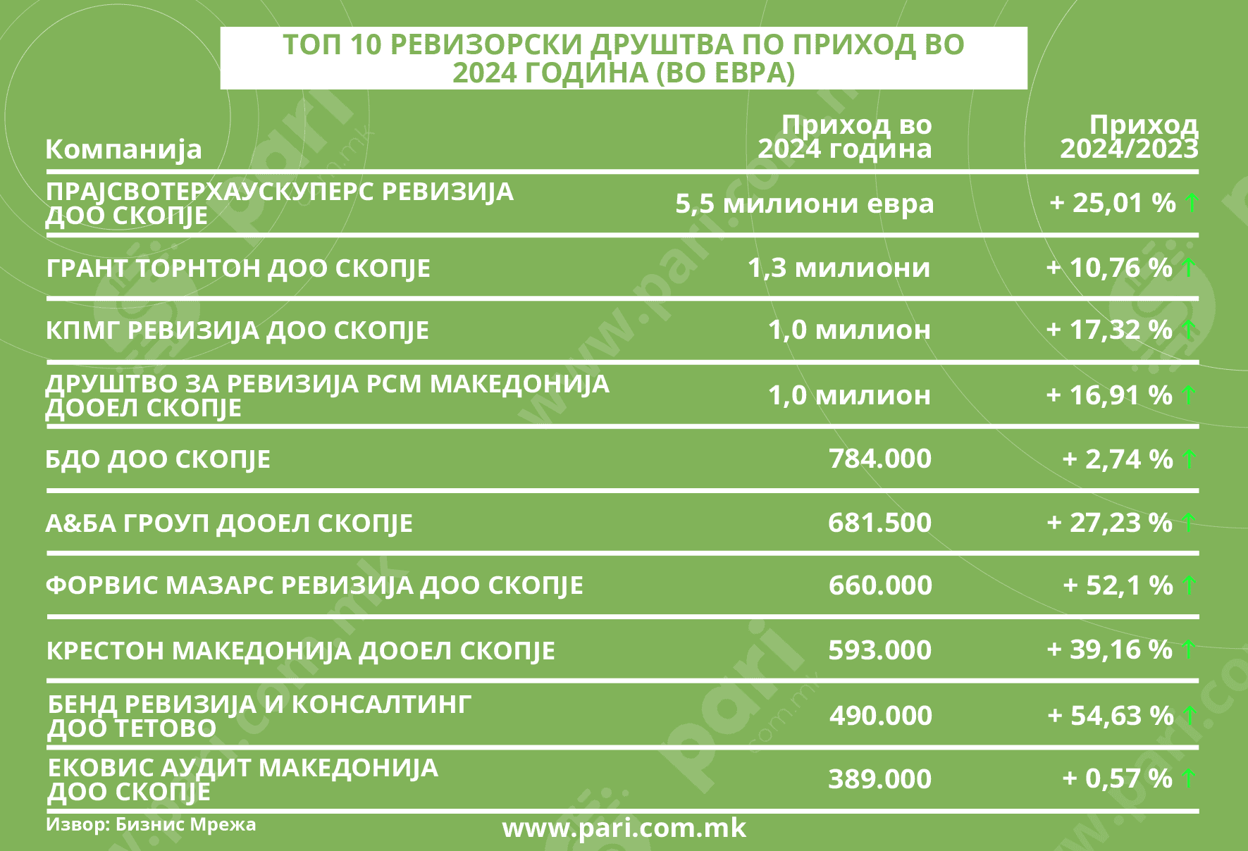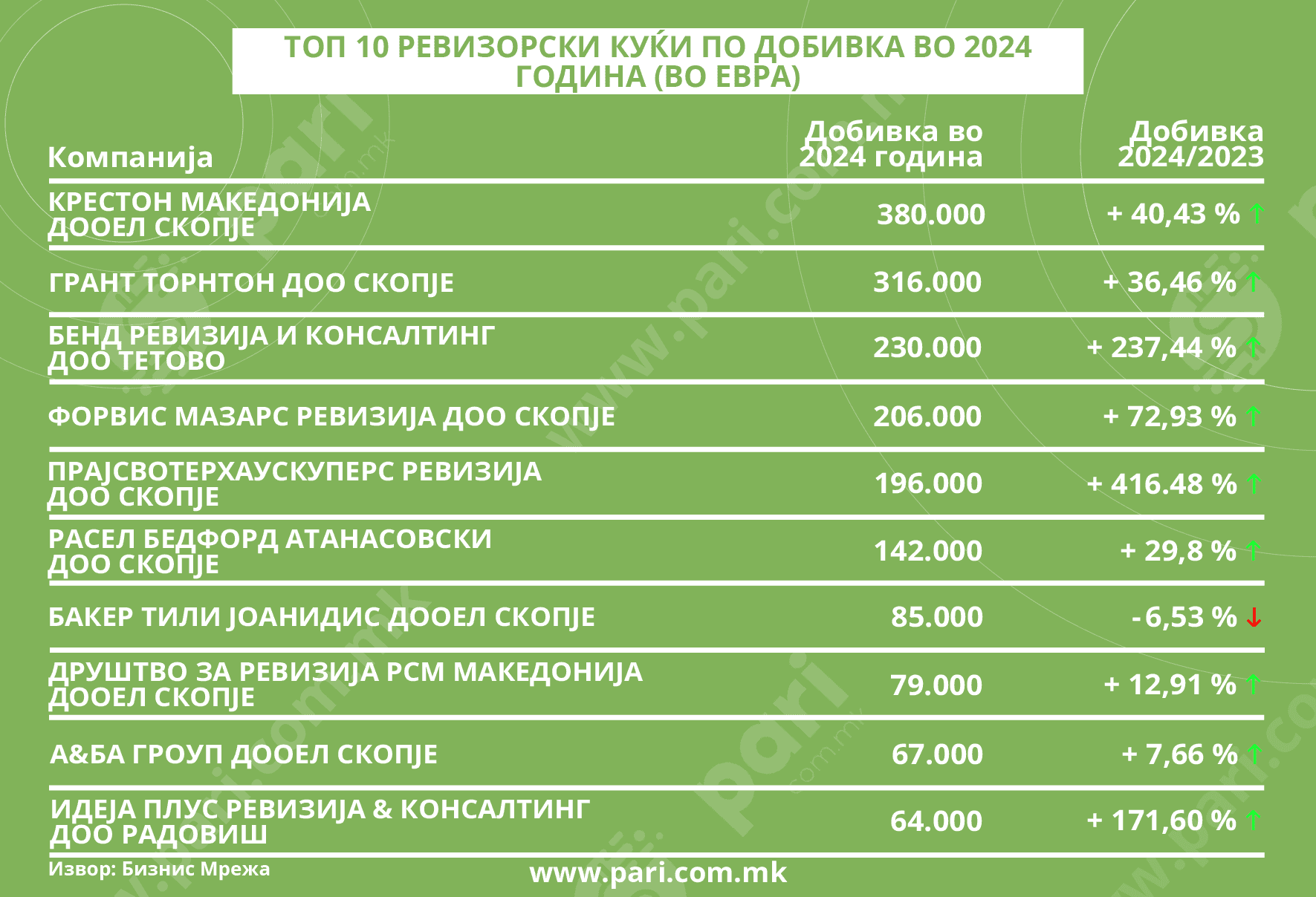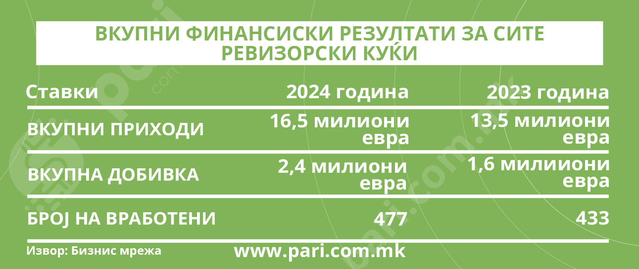 Пари во соработка со Бизнис мрежа ги анализираше податоците за ревизорските куќи. Тие покажуваат дека најзвучните имиња во светот на ревизијата кај нас имаат добивки од по неколку стотици илјади евра.