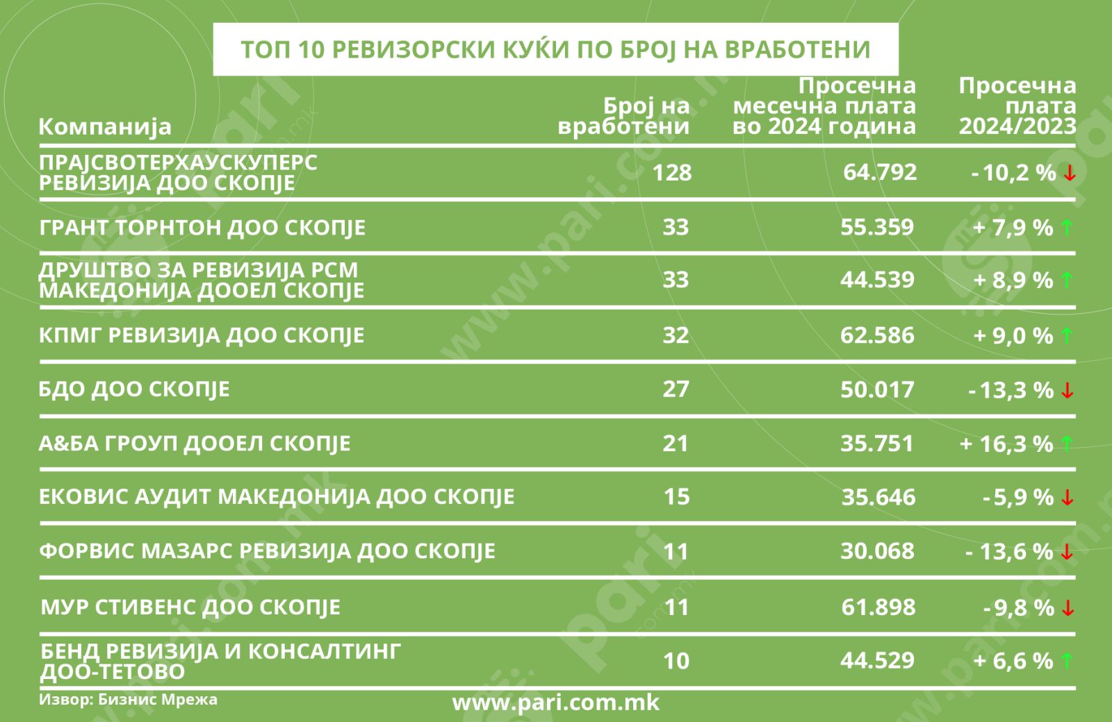 Бројот на вработени во овие ревизорски куќи обично е двоцифрен, но најпрометната Прајсвотерхаускупер има 128 вработени, со просечна плата од 64.792 денари и она што паѓа во очи е што таа е помала отколку во 2023 година, кога била 71.165 денари. Но, ова не е единствена ревизорска куќа со намалување на платите. Од десетте најголеми работодавачи, четири ги намалиле платите.