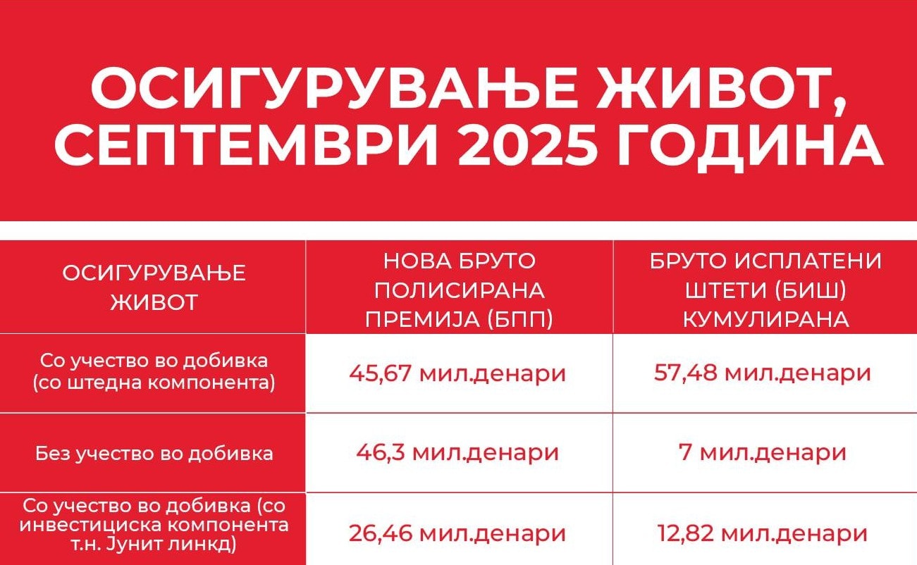 Последните податоци од Агенцијата за супервизија на осигурувањето (АСО), содржани и во прикажаните табели, покажуваат дека во септември, во осигурувањето живот со учество во добивка (со штедна компонента) има нови полиси во вредност од 45,67 милиони денари. Кумулативно исплатените штети, пак, се во износ од 57,48 милиони денари. Или, осигурениците добиле повеќе пари за отштета отколку што платиле како премија.