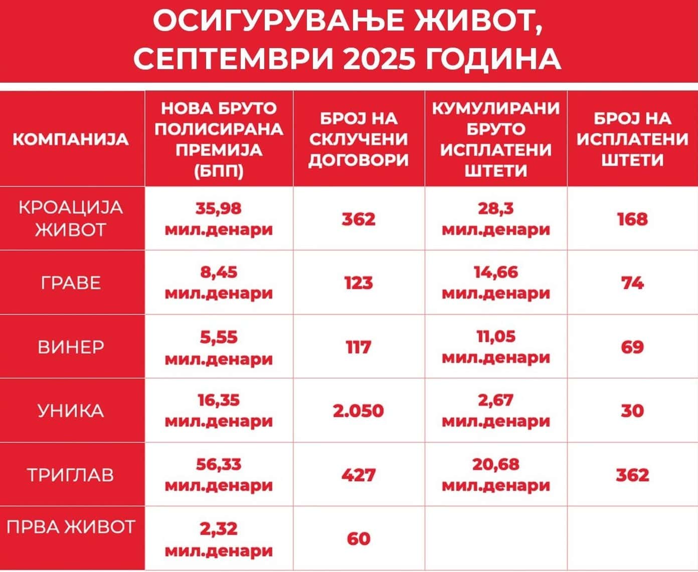 Пазарот на животното осигурување и во септември бележи раст, со значителен обем на продадени полиси и исплатени штети. Новите договори обезбедиле вкупна премија од 118,43 милиони денари. Најголемиот интерес бил насочен кон полисите со учество во добивка и штедна компонента, кои комбинираат осигурување и инвестиција. Стабилни се движењата и кај класичните полиси. Кумулативно, исплатите на штети достигнале 77,3 милиони евра, што е значајно за сигурноста на граѓаните.