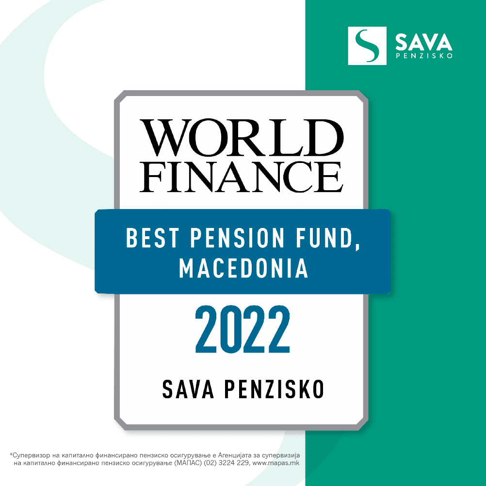По големиот број гласови за поддршка на номинацијата, жири комисијата на специјализираното списание од областа на финансиската индустрија, меѓународниот бизнис и глобалната економија „Ворлд Фајнанс“ го прогласи Сава пензиско друштво а.д. Скопје за победник во категоријата „Најдобар пензиски фонд – Македонија – 2022 година“.