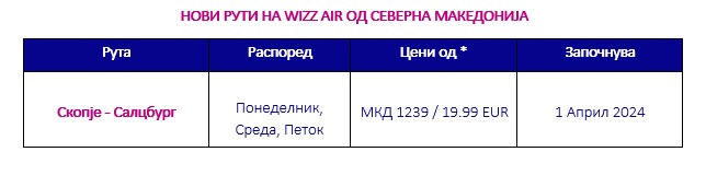 Wizz Air, најголемата авиокомпанија во Северна Македонија и еколошки најодржлива авиокомпанија на глобално ниво**, денеска објави дека ќе започне нова линија од Скопје до Салцбург, Австрија. Планирано e да започне во април 2024 година, преку целата година ќе се изведува три пати неделно во понеделник, среда и петок. Билетите се веќе достапни на wizzair.com или на мобилната апликација на Wizz Air.