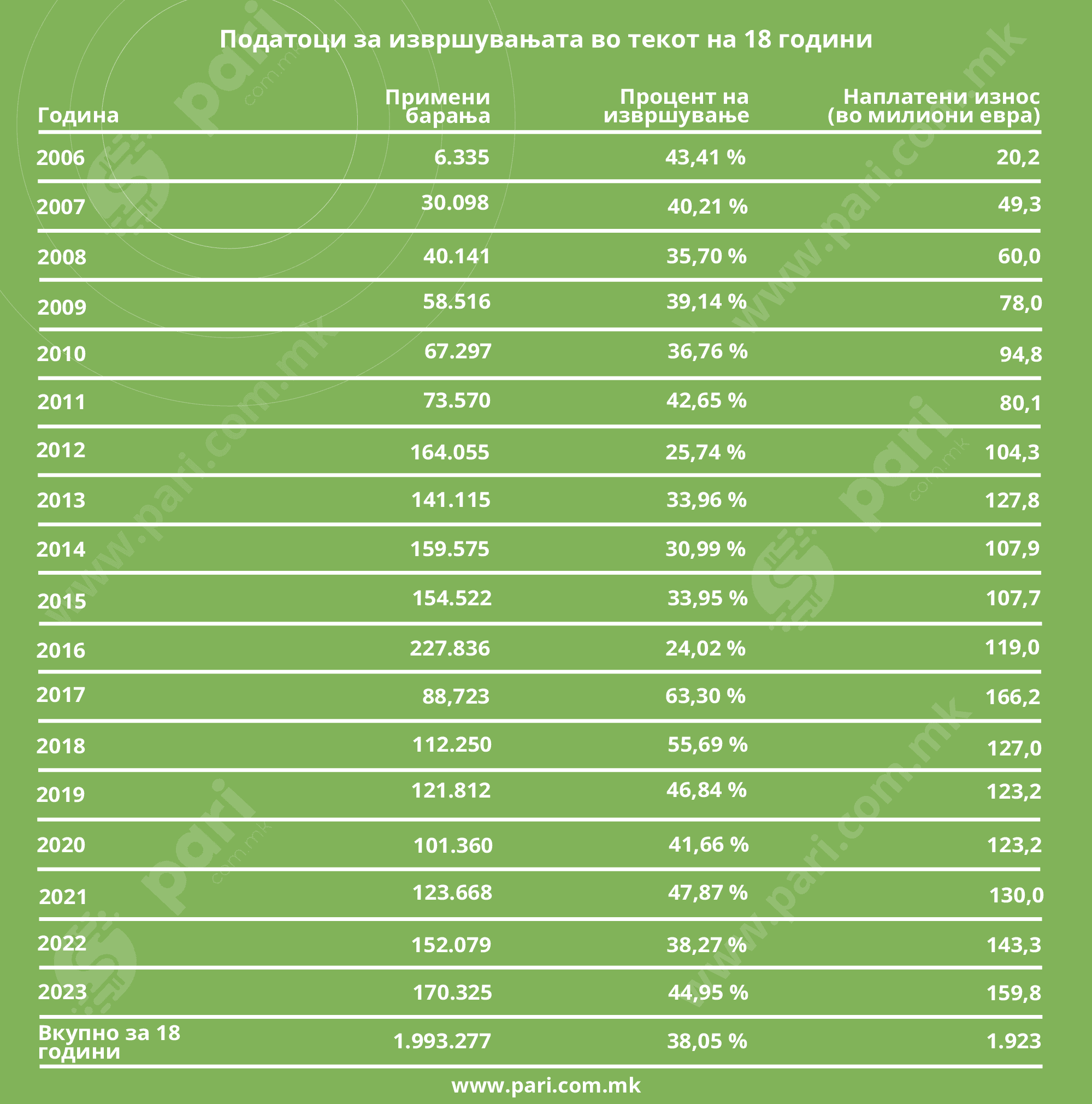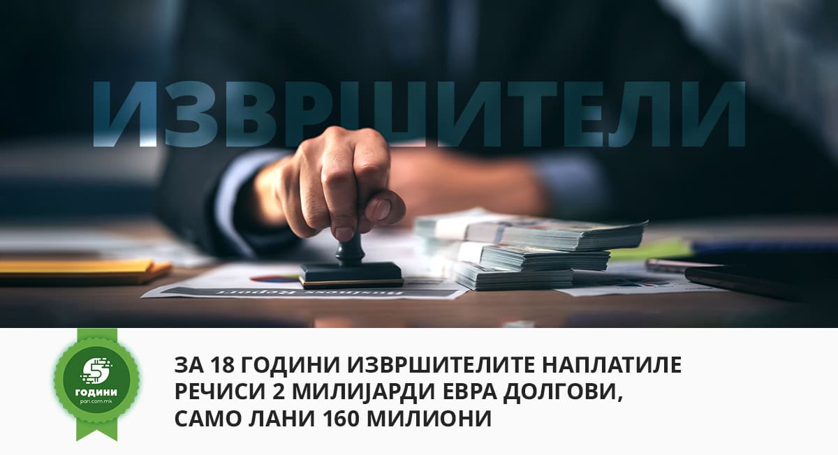 Комората на извршители е формирана во 2006 година и според нејзината евиденција, за 18 години се наплатиле безмалку 2 милијарди евра. Во овој период се примени 1.993.277 барања за присилна наплата преку извршител, реализрани се 758.352, што значи дека имаат и низок процент на реализација – 38%!