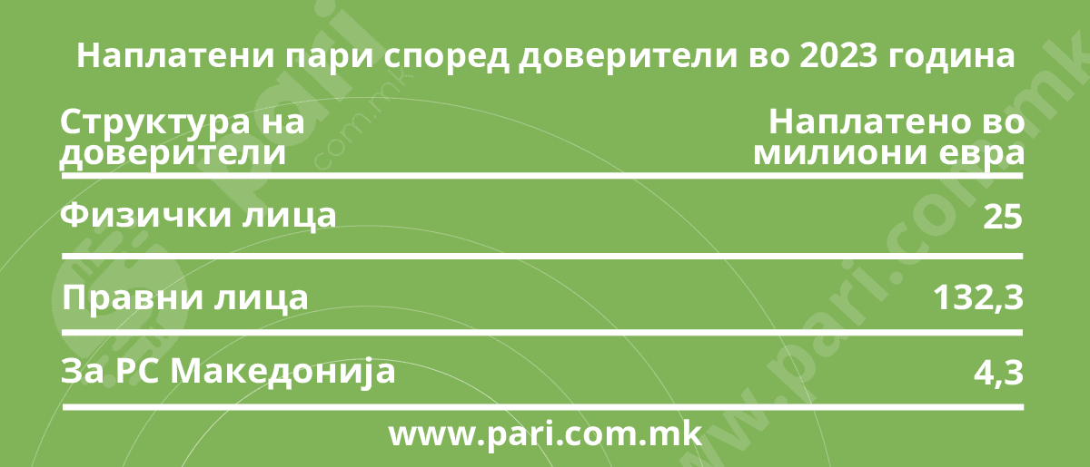 Според структурата на доверители, извршителите во полза на државата во 2023 година наплатила вкупен износ од 4,3 милиони евра, во стопанството се влезени вкупно 132,3 милиони евра, а кај граѓаните 25 милиони евра.