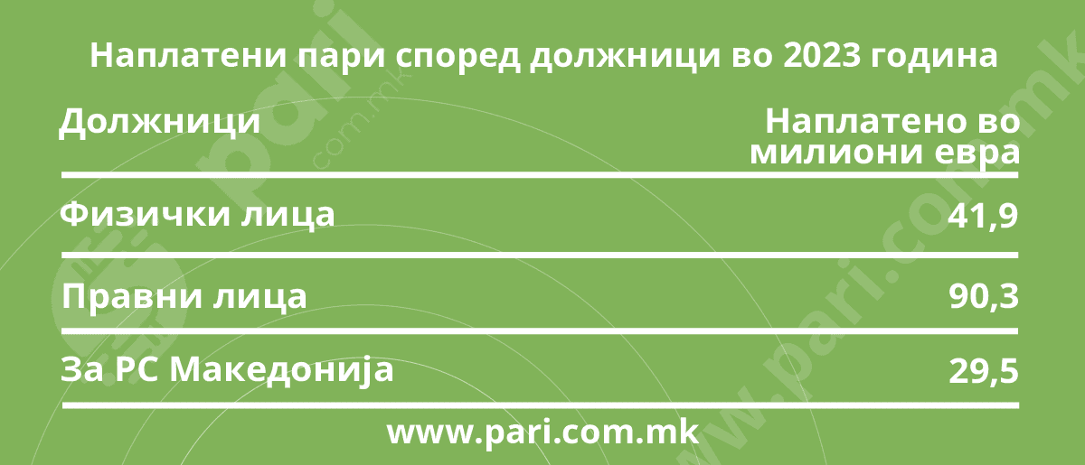 Според структурата на должници, извршителите во 2023 година наплатиле најмногу пари од разни правни лица, над 90,3 милиони евра. Потоа од физички лица износ од 41,9 милиони евра евра и од Република Македонија износ од 29,5 милиони евра.