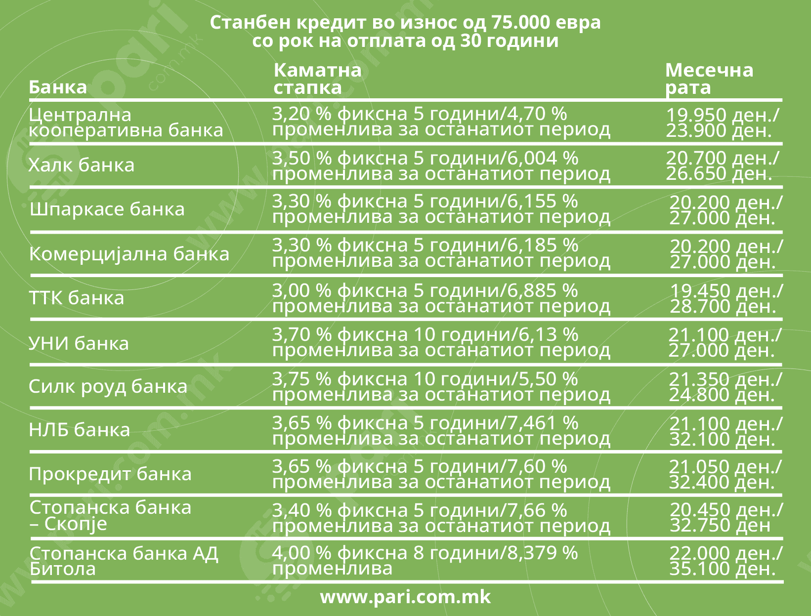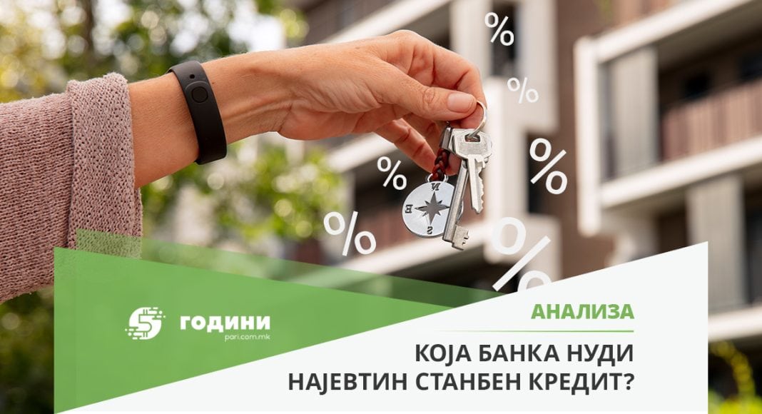 Затоа, порталот „Пари“ ги анализира актуелните понуди на станбени кредити од страна на банките од аспект на висина на каматни стапки и висина на месечна рата за кредит од 75.000 евра (4.600.000 денари) со рок на отплата од 30 години. Со овој кредит би можело да се купи стан во вредност од 100.000 евра, од кои купувачот треба да има веќе обезбедено 25.000 евра за да плати учество, кое, секако, може да биде и помало.