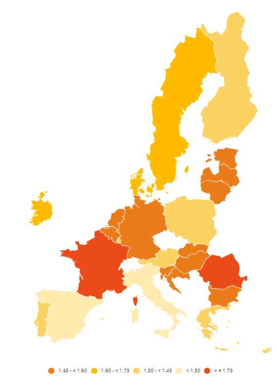 Најниски вкупни стапки на плодност во 2020 година се забележани во Малта (1,13), Шпанија (1,19) и Италија (1,24). Франција е рангирана на прво место, со просечна стапка на фертилитет од 1,83, а потоа следат Романија (1,80), Чешка (1,71) и Данска (1,68).