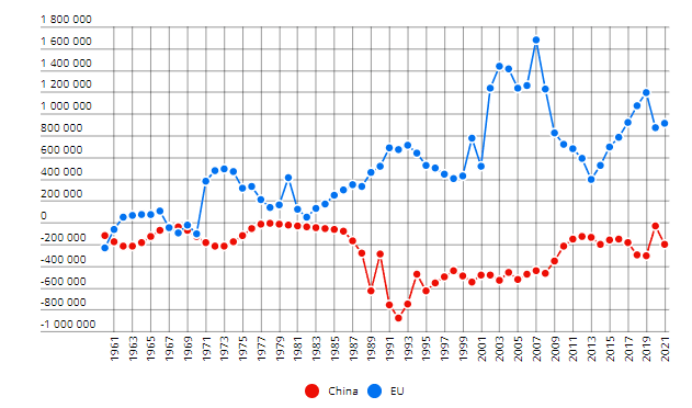 Сепак, бројките на Светска банка покажуваат драматично различна траекторија во текот на следните децении. Во 2021 година, нето стапката на миграција на ЕУ беше +910.755 луѓе, додека за Кина беше -200.194 луѓе.