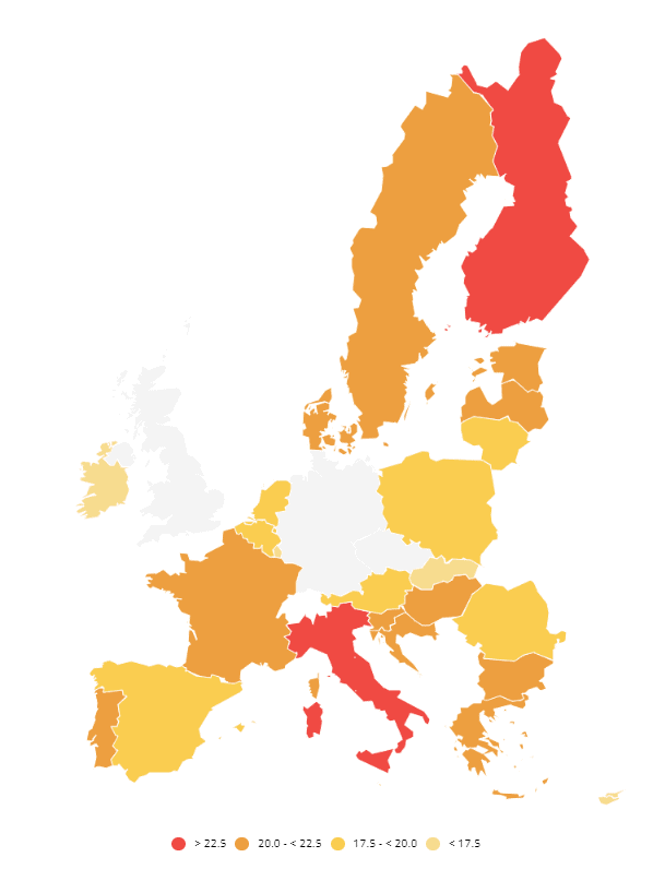 Земјите со најголем дел од населението на возраст од 65 години и повеќе се Италија (22,5 отсто), потоа Финска (22,7 отсто), Грција (22,5 отсто), Португалија (22,4 отсто) и Германија (22 отсто). ).