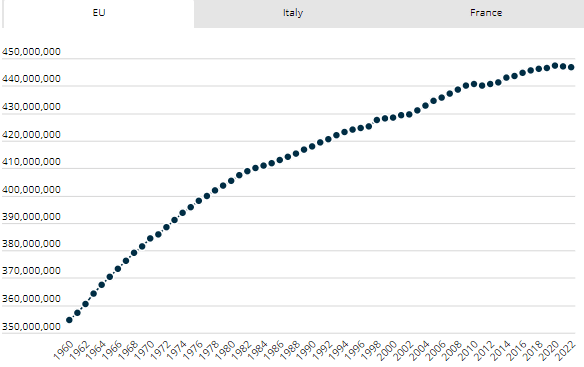 Населението на ЕУ порасна од 354,5 милиони во 1960 година на 446,8 милиони во 2022 година, што претставува зголемување од 26 отсто. Тоа се дополнителни 92,3 милиони луѓе, повеќе од населението на Германија, најголемата членка на блокот со 83 милиони луѓе.