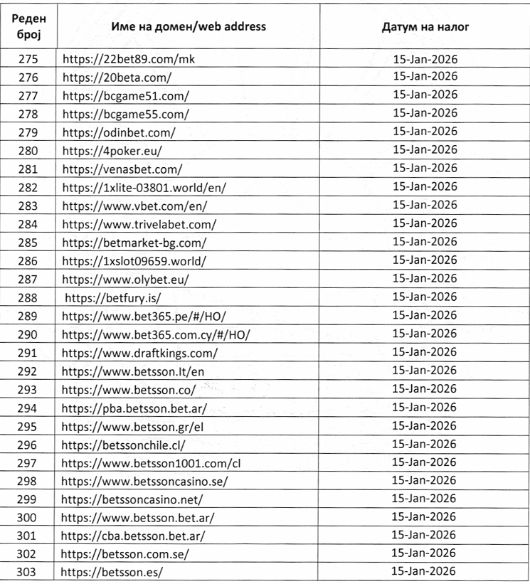 Забранети се уште 33 нелегални веб-страници кои приредуваат игри на среќа. Со тоа, вкупниот број на досега опфатени нелегални страници е 307, информираат од Министерството за дигитлна трансформација.