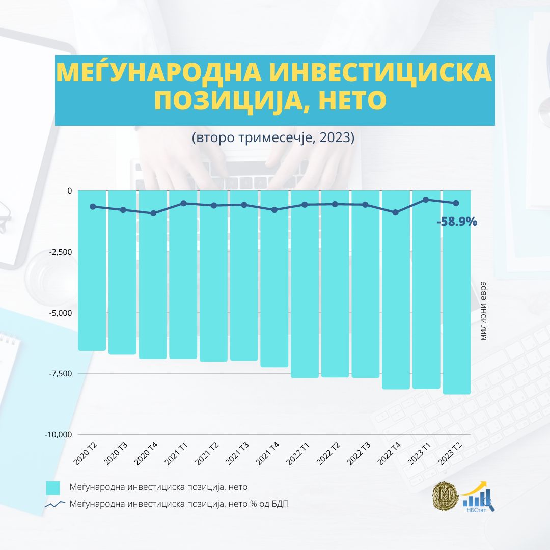 „Во текот на вториот квартал од 2023 година, негативната нето меѓународна инвестициска позиција (МИП) е зголемена за 226 милиони евра и изнесува 8.357 милиони евра, што претставува 58,9% од проектираниот БДП за 2023 година“, се вели во соопштението од Народната банка.