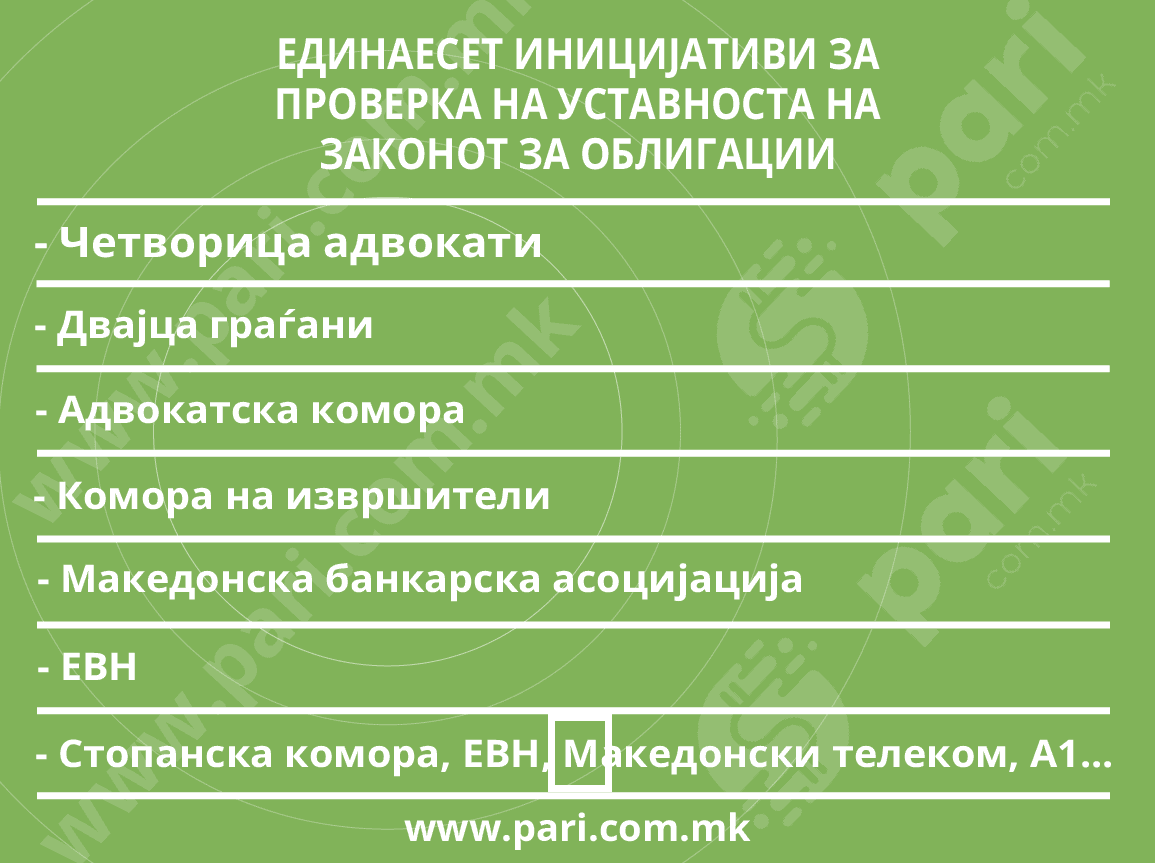 Единаесет иницијативи, како што дознава www.pari.com.mk, се за преиспитување на уставноста на Законот за облигациони односи, а четири иницијативи се за преиспитување на Законот за извршување.