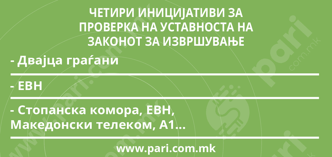 За преиспитување на уставноста на Законот за извршување се поднесени четири иницијативи, и тоа од двајца граѓани, од ЕВН, како и заедничка од Стопанската комора, ЕВН, Македонски телеком, А1…