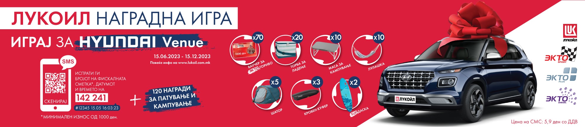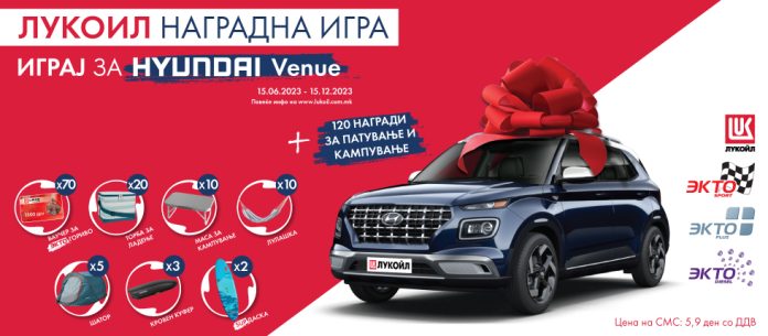 Денес, официјално започна големата наградна игра „Играј за Hyundai Venue и 120 други награди за патување и кампување” на „ЛУКОИЛ Македонија”. Наградната игра им нуди можност на сите свои потрошувачи да играат и да освојуваат вредни награди.