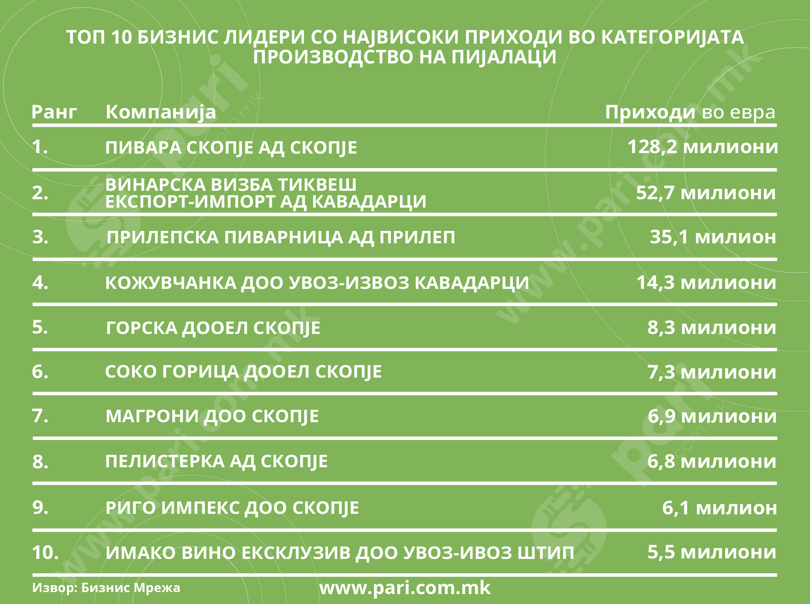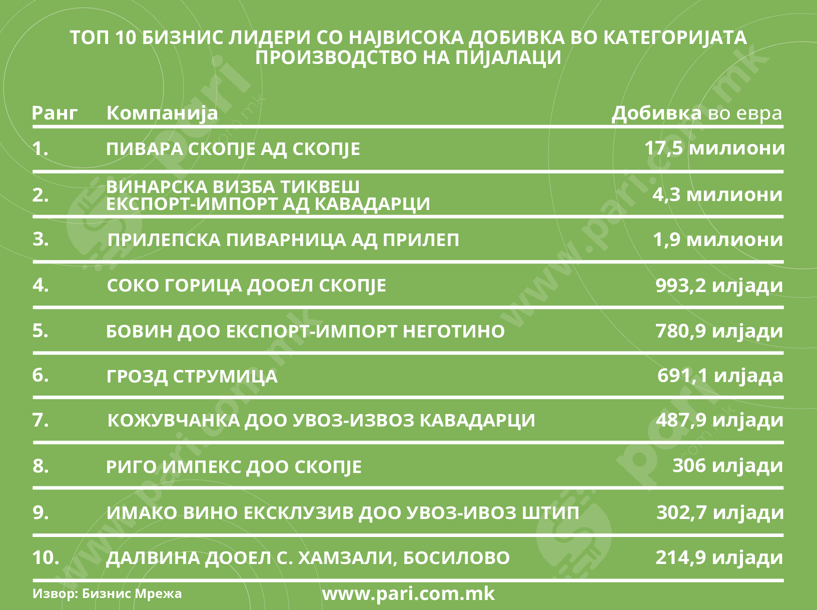 Порталот Пари ги анализираше податоците од Бизнис мрежа за приходите и добивките што ги направија најголемите компании од оваа категорија во 2023 година. Десетте бизнис-лидери инкасирале над 270 милиони евра вкупно продавајќи им квалитетни пијалаци на граѓаните.
