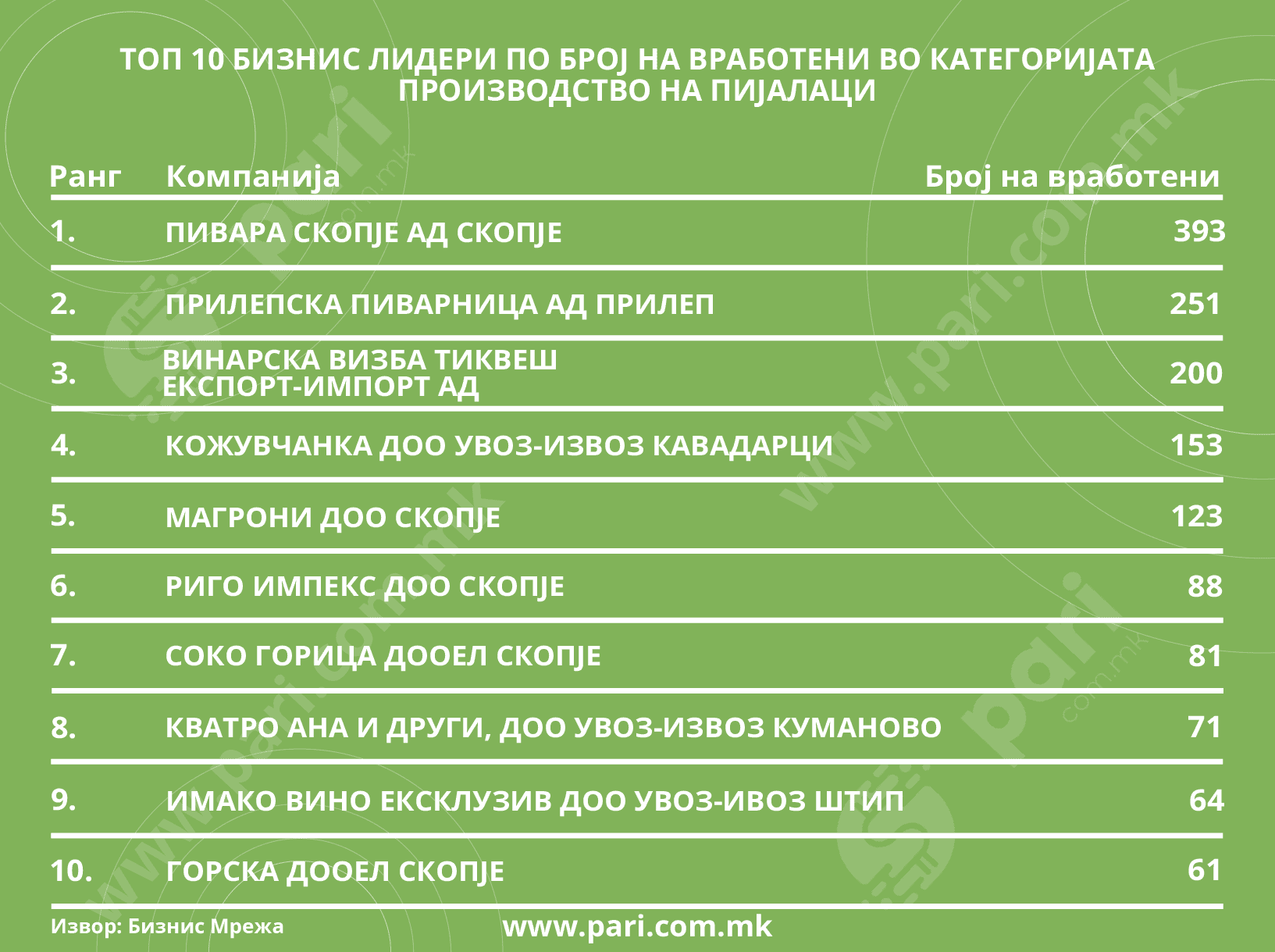Највредниот ресурс на компанијата се вработените. Во овие 10 бизнис-лидери има вкупно 1.485 вработени. Најмногу вработени имаат компаниите Пивара Скопје и Прилепска пиварница. Во Пивара Скопје заработуваат 393 работници, а во Прилепска пиварница 251 работник. Тиквеш брои 200 вработени, Кожувчанка 153, а во Магрони заработуваат 123 лица. Во втората петка бизнис-лидери по број на вработени, компаниите имаат ангажирано од 61 до 88 вработени.
