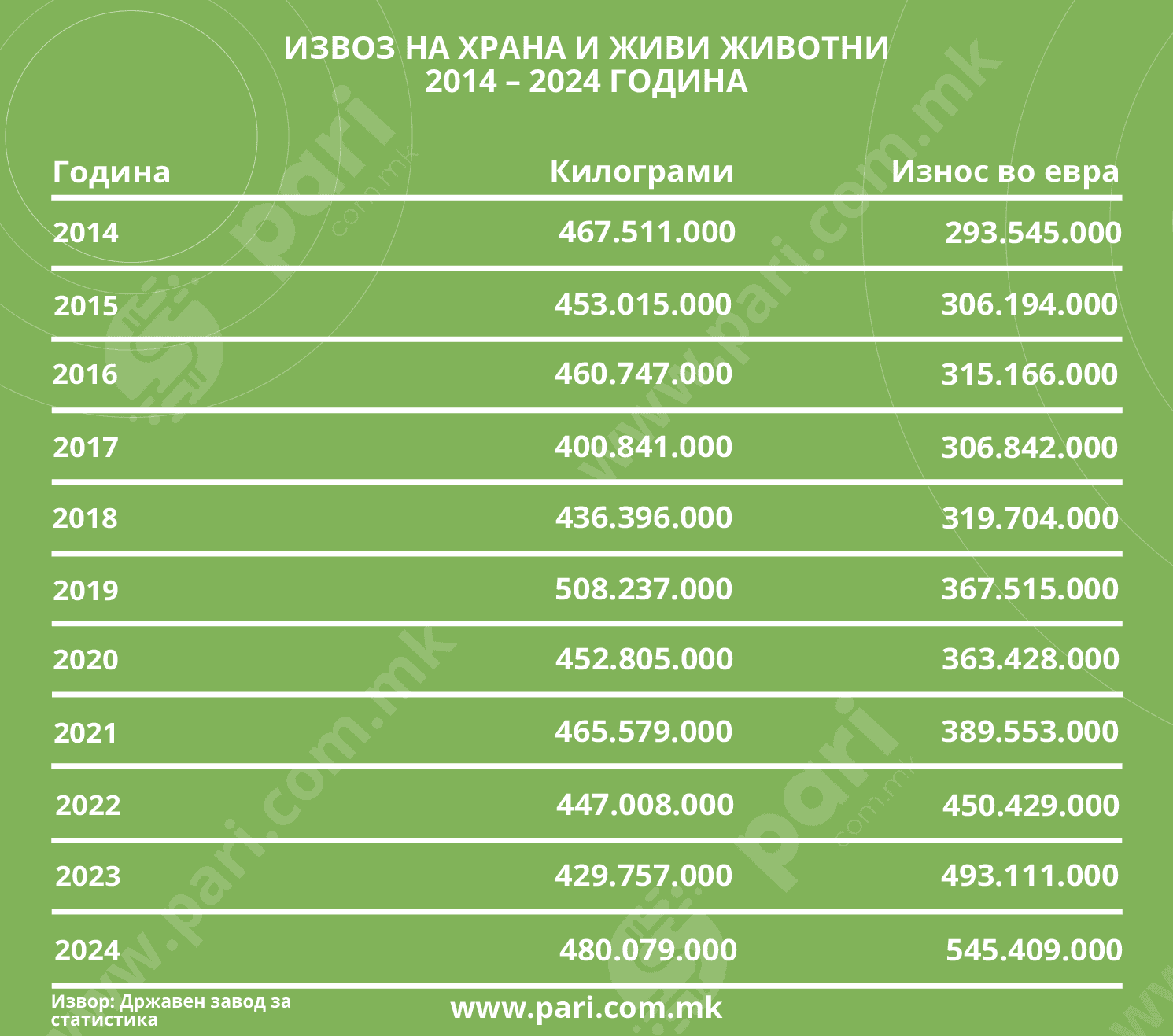 Па, од 676.518.000 килограми храна и живи животни, кои во 2014 чинеле 517.790.000 евра, се доаѓа до минатогодишниот резултат: увезени 784.841.000 килограми во износ од 1.067.298.000 евра. За една деценија разликата е близу 550 милиони евра.