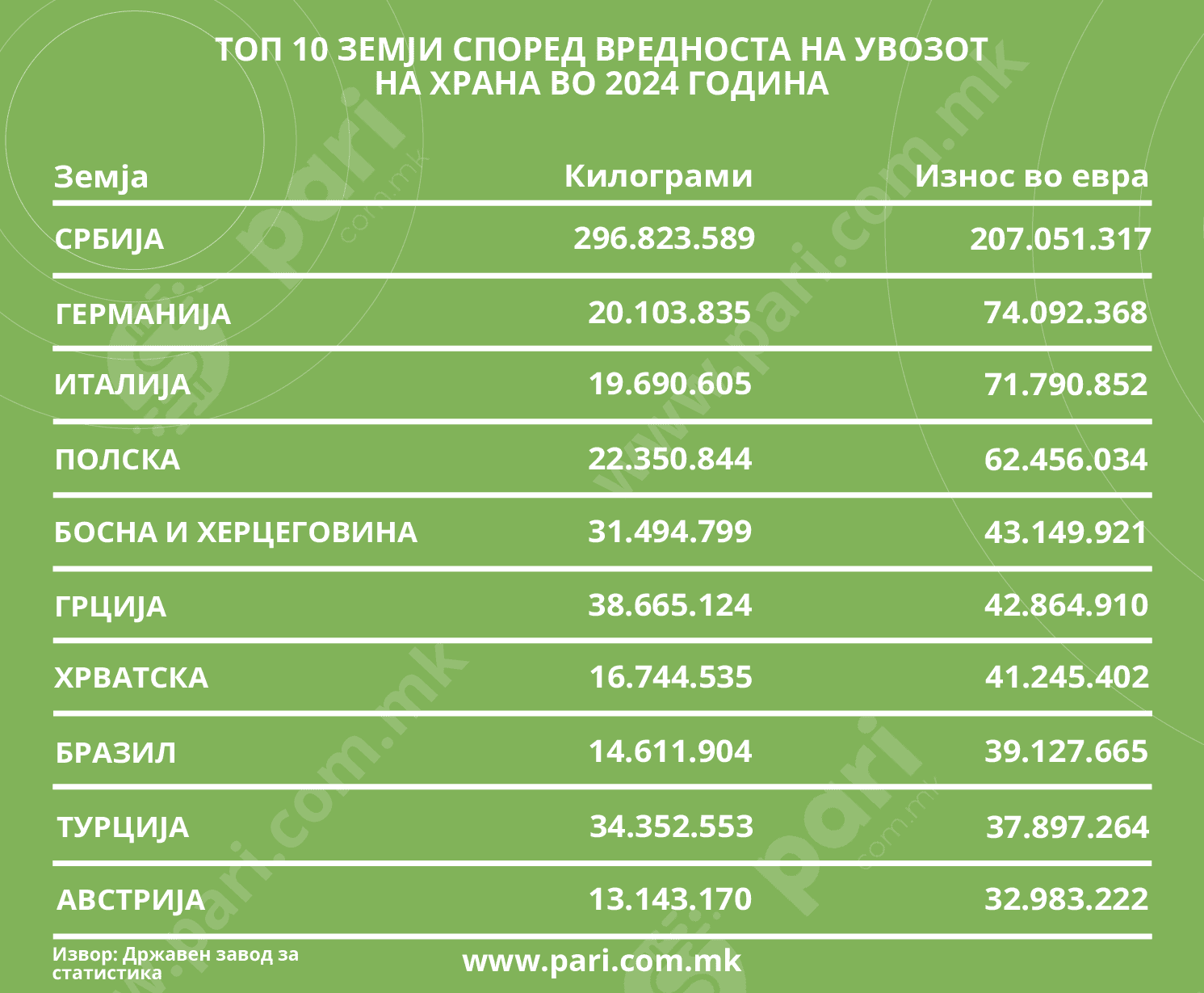 Лани, во Македонија пристигнала храна од 119 земји. Најмногу од Србија – скоро 297 илјади тони за кои се одлеале над 207 милиони евра. Меѓу нашите големи „хранители“ има уште две држави од некогаш заедничката ЈугославијаБосна и Херцеговина и Хрватска. Всушност, увезуваме од сите братски републики: од Словенија за 22,6 милиони евра, од Црна Гора за 1,8 милиони евра, а од Косово – за безмалку 11 милиони евра.