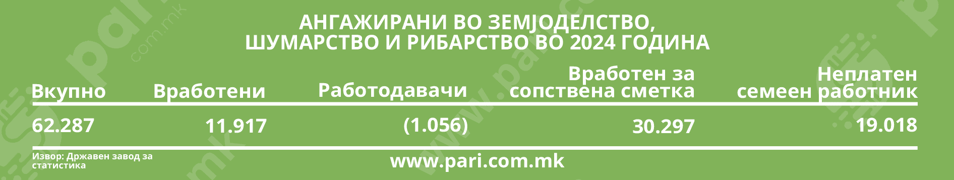 Државата не е способна самата да си обезбеди храна. Уште полошо, не презема конкретни мерки да го спречи или да го забави овој погубен тренд за домашното земјоделско производство. Од 2014 до 2024, во просек, годишната потреба за увоз се зголемувала за 10.832 тони. Паралелно со тоа, растат и сумите што се одлеваат во странство. Просечно, за околу 54,95 милиони евра годишно во изминатата деценија. Истовремено, во секторот земјоделство, шумарство и рибарство бројот на активните лица е намален за 51,12 проценти. Податоците на Државниот завод за статистика што ги анализира порталот Пари, се загрижувачки.