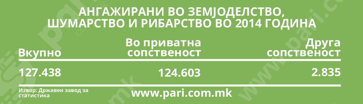 Овој сектор, и покрај осипувањето, е меѓу трите најзначајни, по преработувачката индустрија и по трговијата (и на големо и на мало), според можностите за работа и вработување. Официјалните бројки покажуваат дека во овој, од витално значење за секоја земја, сектор, лани лебот го ваделе 62.287 лица. Пред десет години, во таа графа биле запишани 127.438 вработени.