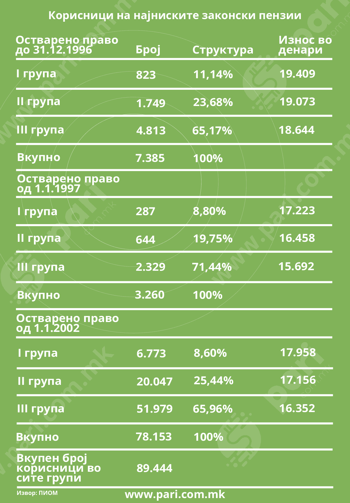 Разлика има и кај примателите на најниските законски пензии. Во ноември, пензиите одредени во границите од 15.692 до 19.409 денари биле исплатени на 88.892 корисници. Веќе во декември има плус 552, односно вкупно 89.444 пензионери.
