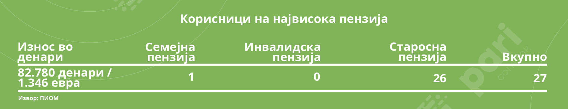 Сепак, во статистиката има мала позитивна месечна промена кај бројот на лицата кои на сметките добиваат пензии поголеми од 59.981 денар. Од 3.056 во ноември, на 3.186 во декември. Или процентуално, од 0,90 на 0,92 отсто од вкупниот број корисници на пензија. Тоа, пак, значи дека уште 130 пензионери се во групата приматели на пристојни пензии. Заедно со тие 27, кои се издвојуваат со месечните примања од над 1.300 евра.