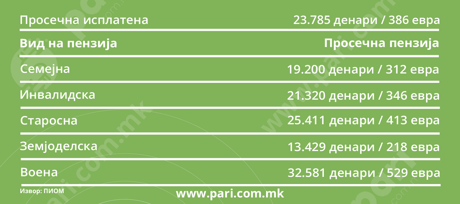 Во Македонија има 345.794 корисници на пензија, според статистиката на ПИОМ за декември. Просечните пензии им се движат од 218 евра колку што е земјоделската, до 529 евра – воената.