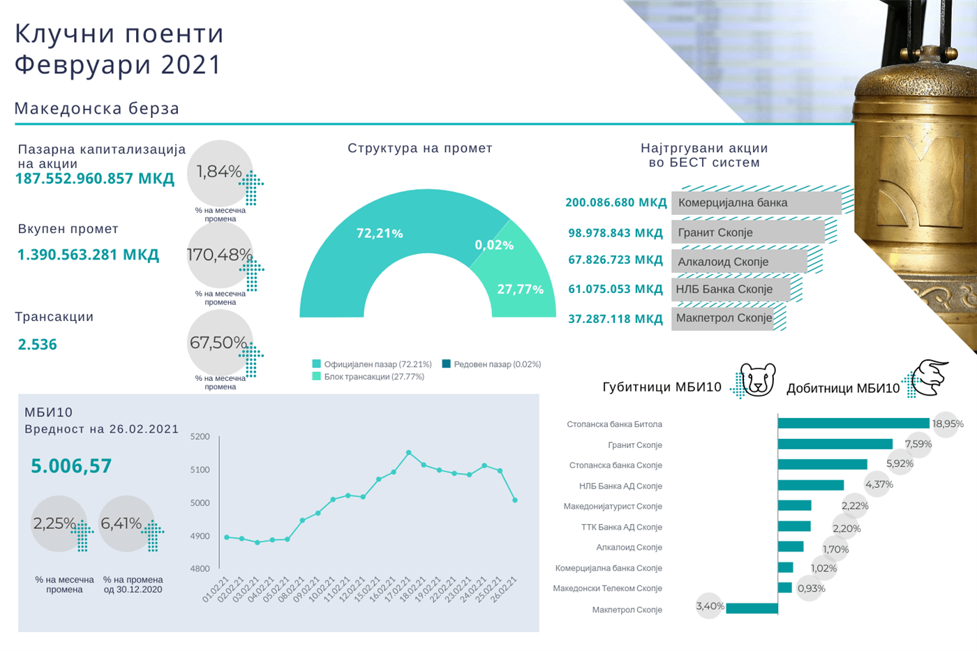 Aкциите на Комерцијална банка во месец февруари 2021 година се со промет од 200.086.680 денари или 3.243.170 евра и го заземаат првото место на најтргувани акции на официјалниот пазар за месец февруари. Потоа следат акциите на Гранит Скопје и Алкалоид Скопје.