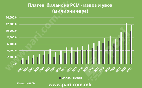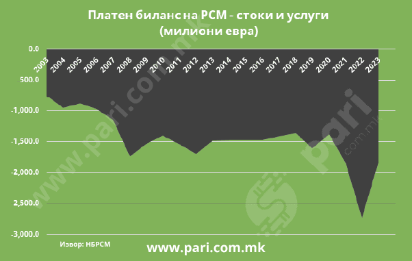 Лошата состојба на македонската економија ја отсликува и платниот биланс на државата во сегментот стоки и услуги. Тој покажува целосна увозна зависност на економијата. Според податоците на Народната банка, платниот биланс на земјата постојано е во минус поради доминацијата на увозот над извозот. Притоа состојбите се се полоши – ако во 2003 година минусот во платниот биланс изнесувал 756,8 милиони евра, во 2023 година изнесува 1,8 милијарди евра.