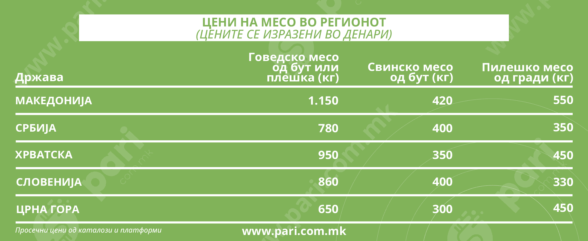 Анализата што ја направи Пари користејќи он-лајн флаери на трговски синџири од регионот, како и нивни специјалзирани платформи за цени, покажува дека Македонија не е само на врвот по цените на говедското месо, туку и на другите видови месо, но со помали разлики.
