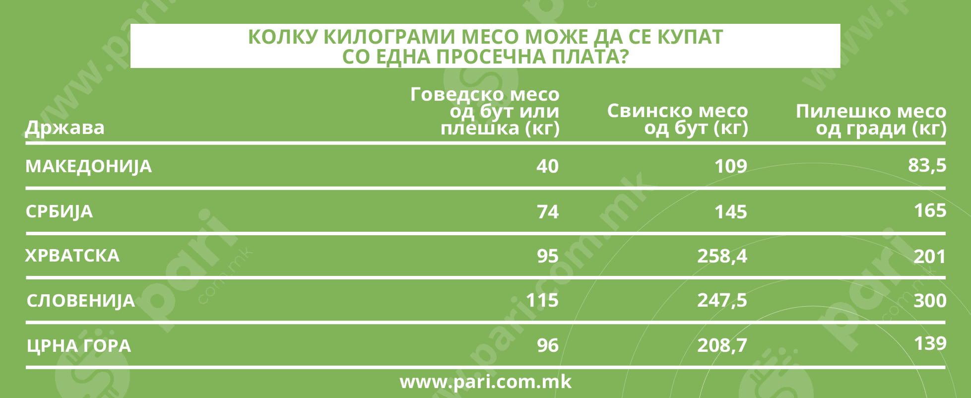 Од податоците јасно се гледа дека Словенците може да си дозволат најмногу од сите земји во регионот. Во однос на нас тие со своите плати може да купат речиси трипати повеќе говедско, повеќе од двојно свинско месо и повеќе од тројно пилешко филе.