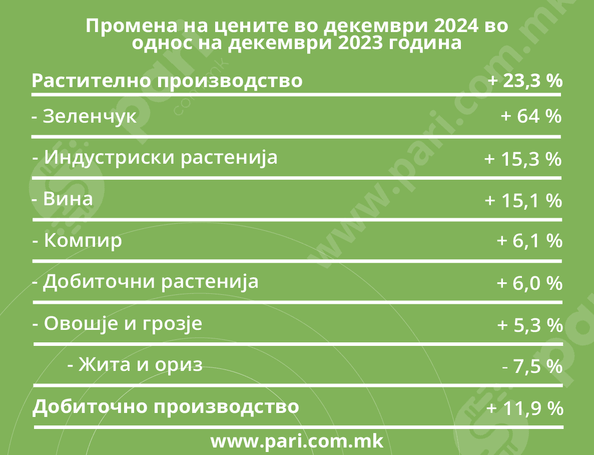 Податоците од декември покажуваат огромен годишен раст на цените на речиси сите земјоделски производи. Единствено, намалување на цените од страна на земјоделците за 7,5 насто има кај житата и оризот.